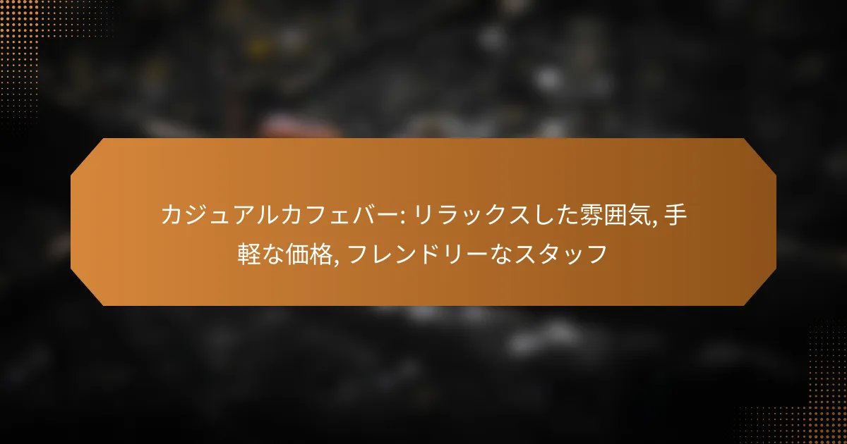 カジュアルカフェバーは、リラックスした雰囲気と手軽な価格設定が魅力の飲食店です。友人や同僚と気軽に集まり、軽食や飲み物を楽しむことができる場所として人気があります。フレンドリーなスタッフが迎えてくれるため、訪れる人々に心地よい体験を提供します。 カジュアルカフェバーとは何か? カジュアルカフェバーは、リラックスした雰囲気で手軽な価格設定を特徴とする飲食店です。友人や同僚と気軽に集まり、軽食や飲み物を楽しむ場所として人気があります。 カジュアルカフェバーの定義と特徴 カジュアルカフェバーは、カフェとバーの要素を融合させたスタイルの飲食店です。一般的には、カジュアルな内装と多様なメニューが特徴で、コーヒーやアルコール、軽食が提供されます。 このような場所では、特にリラックスした雰囲気が重視されており、客は自由に会話を楽しむことができます。営業時間も柔軟で、昼間から夜遅くまで営業していることが多いです。 リラックスした雰囲気の重要性 リラックスした雰囲気は、カジュアルカフェバーの魅力の一つです。心地よい音楽や居心地の良い家具が、訪れる人々にリラックスした時間を提供します。 このような環境では、ストレスを感じずに友人と過ごしたり、仕事の合間にリフレッシュしたりすることが可能です。リラックスできる空間は、顧客の再訪を促す要因ともなります。 手軽な価格設定の利点 手軽な価格設定は、カジュアルカフェバーの大きな魅力です。多くの場合、飲み物や軽食はリーズナブルな価格で提供され、学生や若い社会人にとっても利用しやすいです。 この価格帯により、気軽に立ち寄ることができ、頻繁に訪れることが可能になります。特に、特別なイベントやプロモーションを行うことで、さらにお得に楽しむことができます。 フレンドリーなスタッフの役割 フレンドリーなスタッフは、カジュアルカフェバーの雰囲気を作る重要な要素です。親しみやすい接客が、顧客のリピート率を高める要因となります。 スタッフが積極的にコミュニケーションを図ることで、訪れる人々はより居心地を感じ、リラックスした時間を過ごすことができます。顧客のニーズに応える柔軟な対応も、良好なサービスの一環です。 カジュアルカフェバーの文化的背景 カジュアルカフェバーは、特に都市部での社交的な場として発展してきました。多様な文化が交差する場所であり、さまざまな人々が集まることで独自の文化が形成されています。 このような場所では、地域の特性やトレンドが反映されることが多く、地元の食材や飲み物を取り入れたメニューが人気です。カジュアルカフェバーは、地域コミュニティの中心としても機能しています。 カジュアルカフェバーの価格帯はどのくらいか? カジュアルカフェバーの価格帯は、一般的に手頃で、飲み物や軽食が数百円から数千円程度で提供されます。多くの場所では、リラックスした雰囲気の中で、友好的なスタッフが迎えてくれます。 一般的な価格レンジ カジュアルカフェバーでは、コーヒーやソフトドリンクが約300円から800円、アルコール類は500円から1,500円程度が一般的です。軽食やスナックは500円から1,200円で楽しめることが多いです。 特にランチメニューやセットメニューを利用すると、さらにお得に食事を楽しむことができます。 地域別の価格差 地域によってカジュアルカフェバーの価格には差があります。都市部では、賃料や人件費が高いため、価格が高めに設定されることが一般的です。 例えば、東京や大阪の中心部では、同じメニューでも地方都市よりも高い価格が設定されることが多いです。 価格に影響を与える要因 カジュアルカフェバーの価格は、立地、提供するメニューの種類、使用する食材の質によって影響を受けます。特に新鮮な地元の食材を使用している場合、価格が高くなる傾向があります。 また、カフェバーの雰囲気やサービスの質も価格設定に影響を与える要因となります。 お得なメニューやプロモーション 多くのカジュアルカフェバーでは、特定の時間帯や曜日にお得なメニューやプロモーションを提供しています。例えば、ハッピーアワーではドリンクが割引されることがあります。 また、定期的に行われるキャンペーンやポイントカード制度を利用することで、さらにお得に楽しむことができます。 カジュアルカフェバーの雰囲気をどう作るか? カジュアルカフェバーの雰囲気は、リラックスした空間を提供するために重要です。手軽な価格設定とフレンドリーなスタッフが、訪れる人々に心地よい体験をもたらします。 インテリアデザインの要素 インテリアデザインは、カジュアルカフェバーの雰囲気を決定づける重要な要素です。温かみのある色合いや、木材を使用した家具がリラックスした印象を与えます。 テーブル配置は、プライバシーを保ちながらもコミュニケーションを促進するように工夫しましょう。例えば、2人掛け